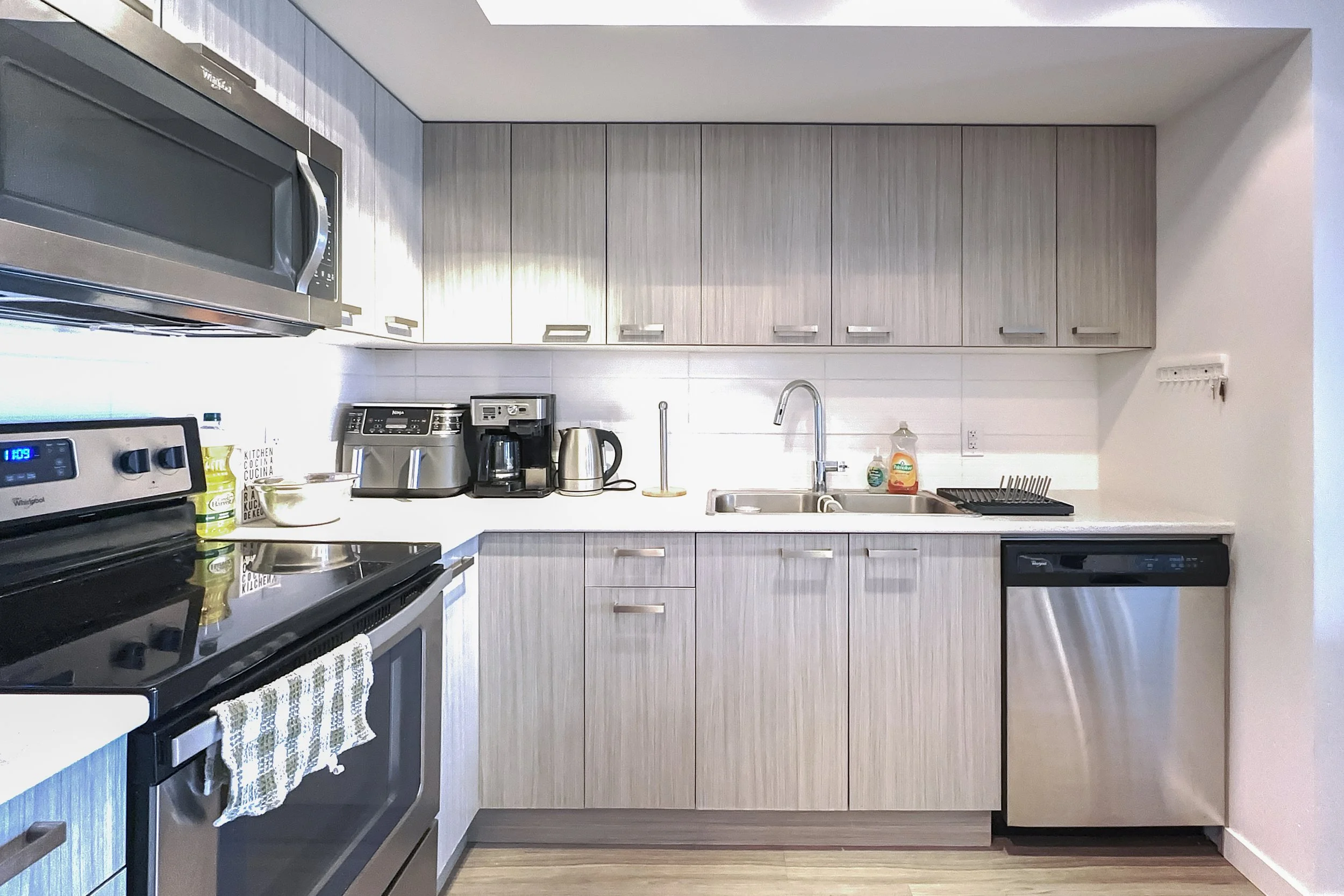 Let’s face it: sharing a common kitchen with a handful of others or cooking every meal in toaster oven and doing dishes by hand gets old. This condo residence is a serious upgrade from dorm life. The kitchen includes full-size appliances including refrigerator/freezer, oven/range, microwave oven, and even a dishwasher. With an abundance of cabinets you can be ready to cook anything you desire and store all the snacks for in between meals. Now let’s talk laundry. No more waiting in line or loading the wash in your living room; this condo has its own laundry closet with a stacking clothes washer and dryer.